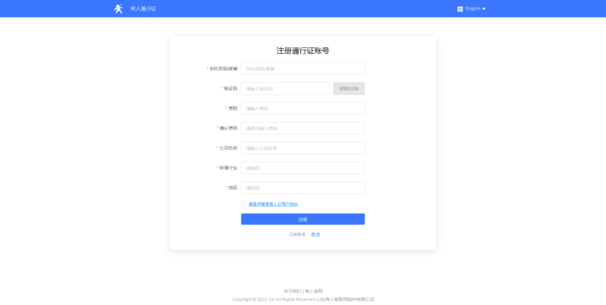 5、打開有人云網(wǎng)頁:http://cloud.usr.cn/ 點(diǎn)擊右上角注冊,根據(jù)主賬號中填寫的手機(jī)號或者郵箱給子賬號注冊有人云通行證。