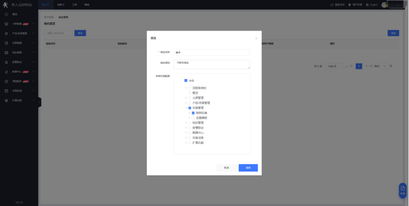 2、登錄有人云控制臺之后,點(diǎn)擊右上角的用戶權(quán)限,點(diǎn)擊角色管理。添加并填寫相關(guān)的角色信息以及菜單應(yīng)用權(quán)限。
