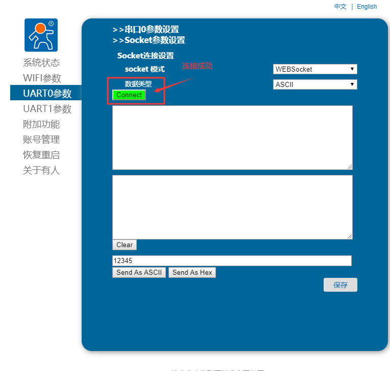 1. 登錄模塊內(nèi)置網(wǎng)頁后,選擇“UART0參數(shù)”,選擇socket模式為“WEBSocket”,點(diǎn)擊保存重啟。