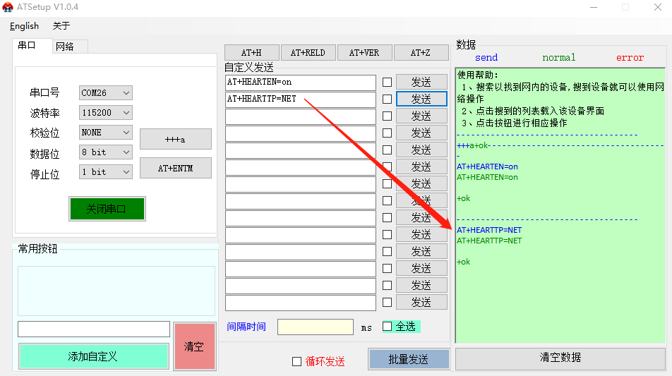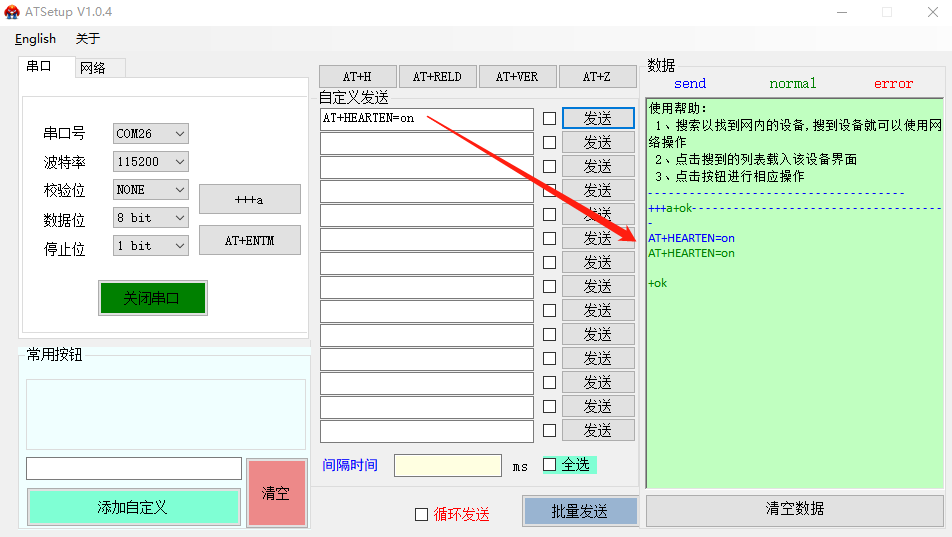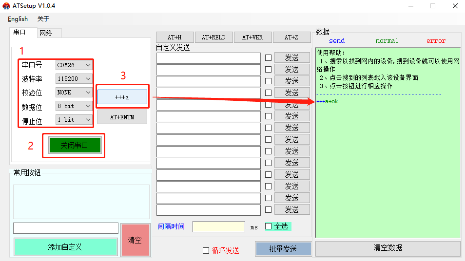 a. 模塊上電,串口連接電腦且以成功建立TCP連接。使用小紅人軟件打開串口,模塊默認(rèn)串口參數(shù)為: 波特率 115200、無校驗(yàn)、8 位數(shù)據(jù)位、1 位停止位。點(diǎn)擊“+++a”,會(huì)返回+ok,說明已經(jīng)進(jìn)入命令行模式。