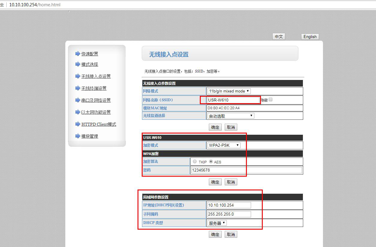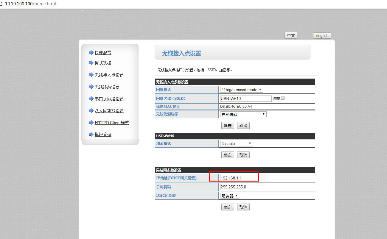 1、1號(hào)USR-W610 AP模式參數(shù)設(shè)置: