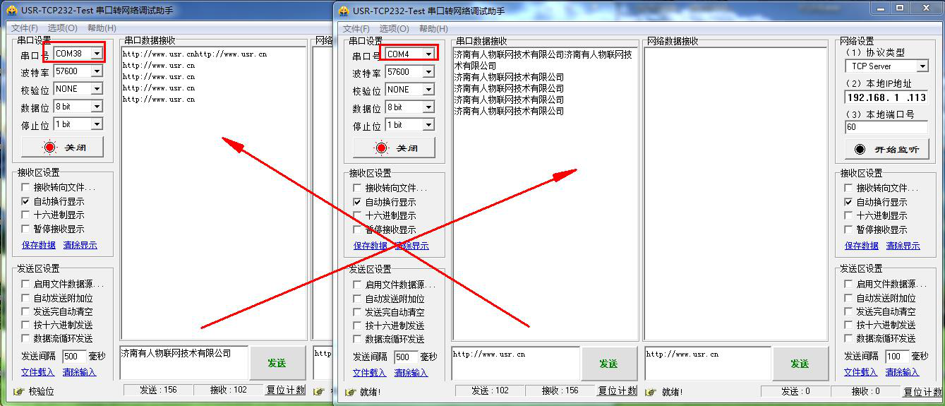 在電腦上用USR-TCP232-TEST軟件測(cè)試,分別打開(kāi)對(duì)應(yīng)的兩個(gè)COM口,測(cè)試兩個(gè)串口之間相互傳輸數(shù)據(jù)。