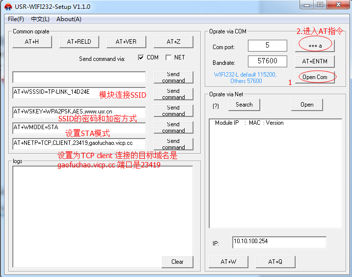 1:使用AT指令設(shè)置。設(shè)置模塊連接的域名和端口,設(shè)置模塊連接到可以連接互聯(lián)網(wǎng)的路由器。模塊設(shè)置為STA模式。設(shè)置軟件下載鏈接:http://m.lifj.com.cn/Download/91.html