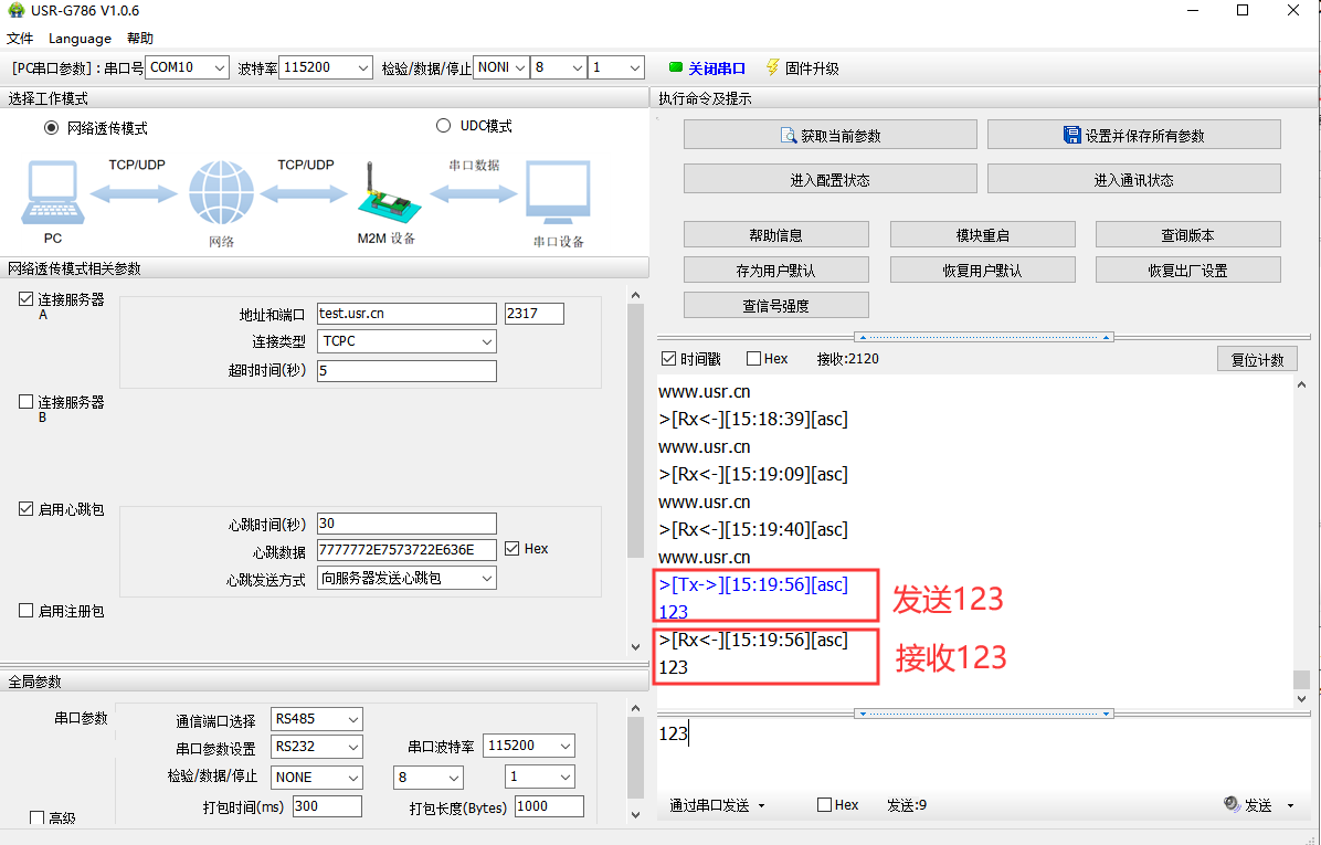 4. G786出廠默認是232串口配置參數(shù),485串口通信,以上參數(shù)均使用232串口設(shè)置的,設(shè)備重啟以后,需要打開485串口,在485串口進行通信,下圖可以看的發(fā)送“123”,測試服務(wù)器回復“123”,表示已經(jīng)測試成功;