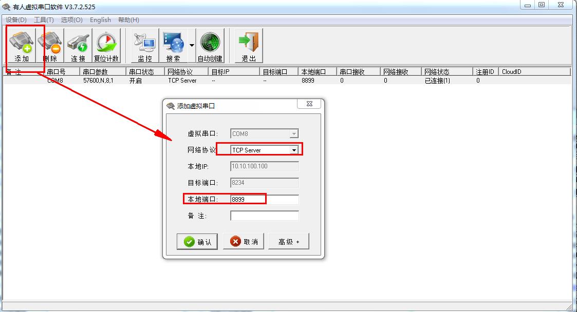電腦關(guān)閉殺毒軟件和防火墻,下載并安裝虛擬串口軟件,手動(dòng)添加一個(gè)COM口,做TCP server,端口8899。