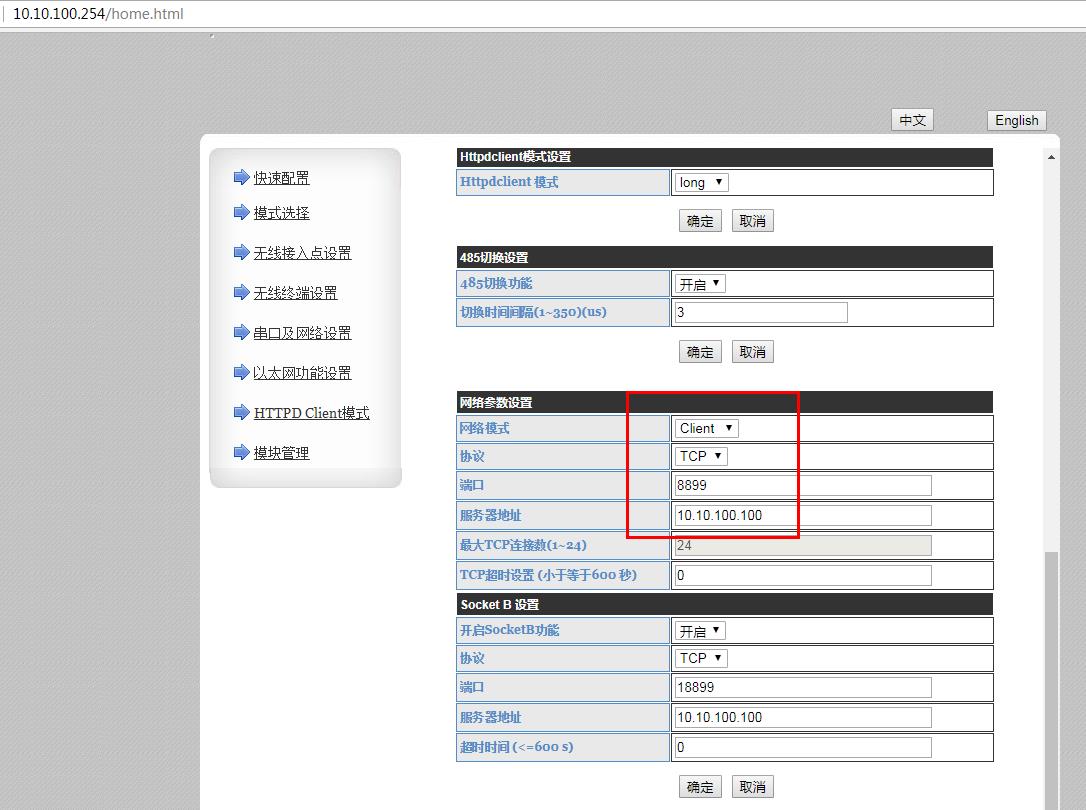 DR404在網(wǎng)頁上,串口及網(wǎng)絡(luò)設(shè)置,設(shè)置網(wǎng)絡(luò)模式TCP client,服務(wù)器IP填電腦IP10.10.100.100,端口填8899。保存參數(shù),重啟DR404