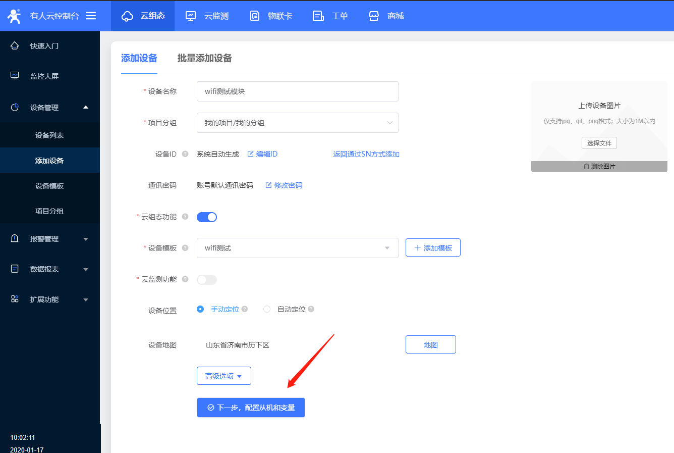 6、設(shè)置設(shè)備名稱,和項目分組,C215目前只能使用ID方式添加設(shè)備id;設(shè)備id和密碼設(shè)置默認就可以,選擇云組態(tài),添加數(shù)據(jù)模板;