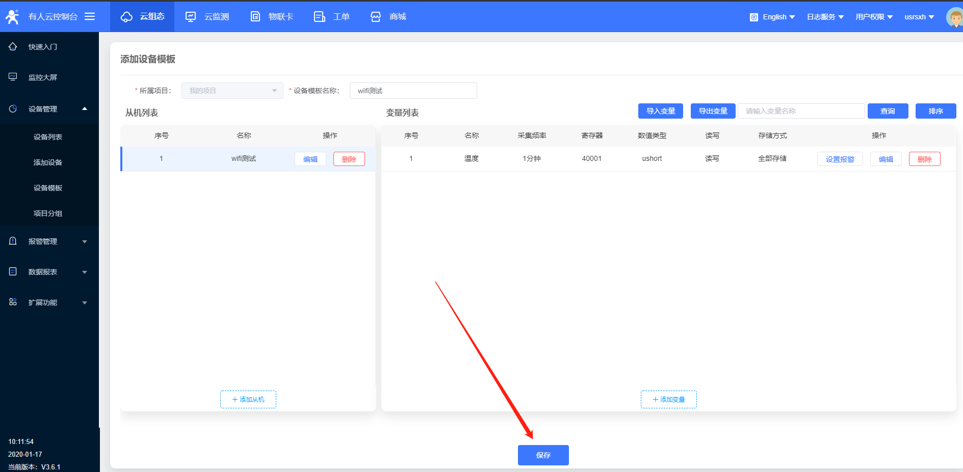 7、模板更改名稱,選擇modbus rtu協(xié)議,點擊保存