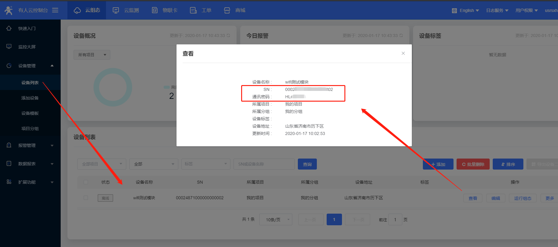 15、設(shè)置完所有的參數(shù)要重啟設(shè)備,稍等一會,在有人云界面,您會看到設(shè)備已經(jīng)上線