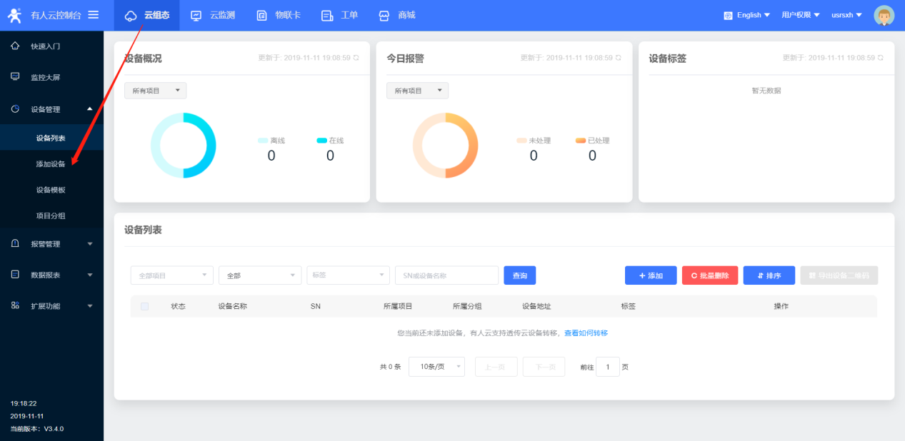 5、本次案例是C216連有人云進(jìn)行數(shù)據(jù)顯示,可以進(jìn)入云組態(tài),選擇添加設(shè)備;