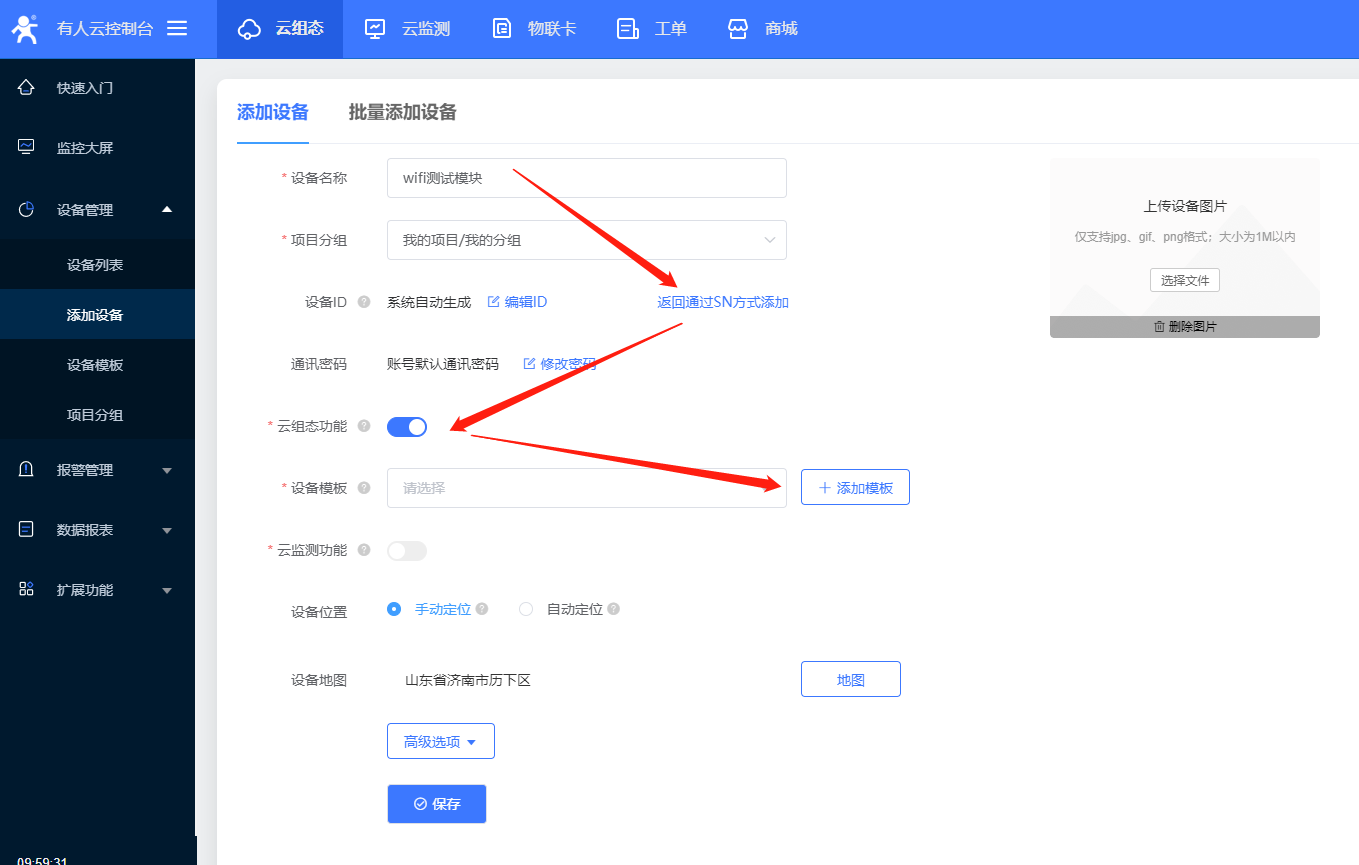 6、設(shè)置設(shè)備名稱,和項(xiàng)目分組,C216目前只能使用ID方式添加設(shè)備id;設(shè)備id和密碼設(shè)置默認(rèn)就可以,選擇云組態(tài),添加數(shù)據(jù)模板;
