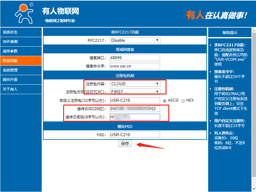 14、進(jìn)入附加功能,注冊(cè)包選擇透傳云,填上透傳云上新建立的設(shè)備id,和密碼(如下圖所示),點(diǎn)擊保存