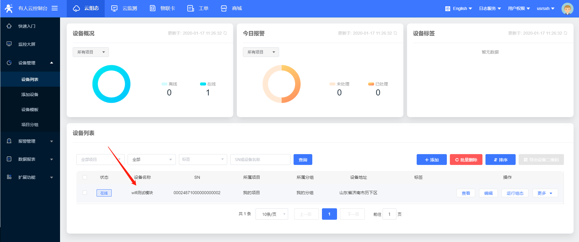 15、設(shè)置完所有的參數(shù)要重啟設(shè)備,稍等一會(huì),在有人云界面,您會(huì)看到設(shè)備已經(jīng)上線