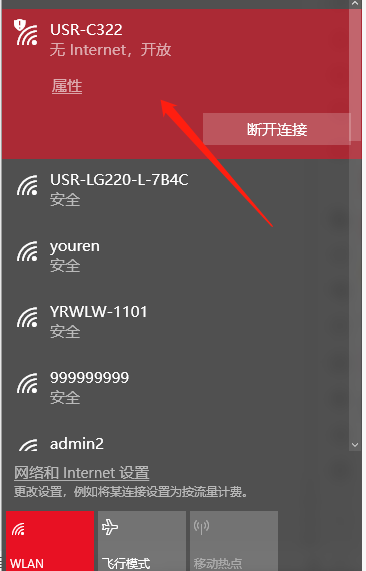 (1) 將模塊焊接到測(cè)試底板上,測(cè)試板串口連接電腦串口,電腦連接WiFi。在電腦無(wú)線搜索欄,搜索USR-C322,連接。
