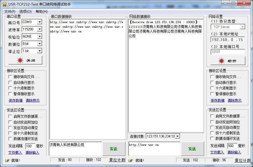 9、 通過調(diào)試助手建立TCPSERVER,串口和網(wǎng)絡(luò)端分別發(fā)送數(shù)據(jù)來測(cè)試:
