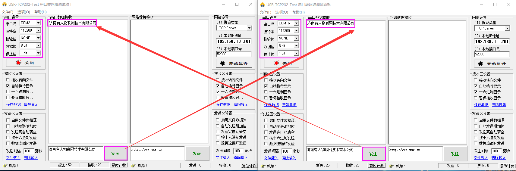 同時(shí)打開兩個(gè)串口轉(zhuǎn)網(wǎng)絡(luò)助手軟件。一個(gè)選擇虛擬串口,一個(gè)選擇COM16,即可進(jìn)行收發(fā)測(cè)試。