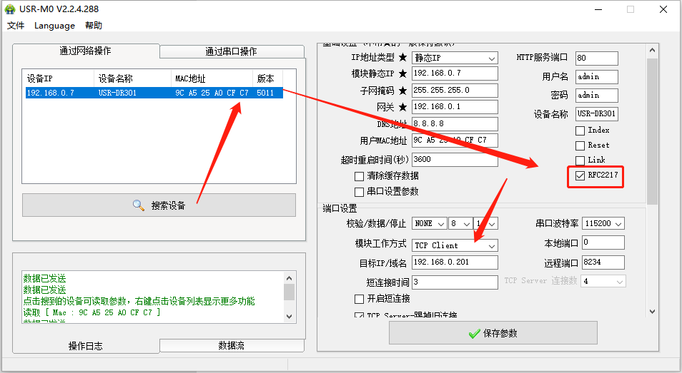 點(diǎn)擊“搜索設(shè)備”當(dāng)搜索列表中出現(xiàn)301的設(shè)備后,單擊搜索到的設(shè)備,查看其配置信息,勾選RFC2217,其余配置可按照?qǐng)D片設(shè)置。