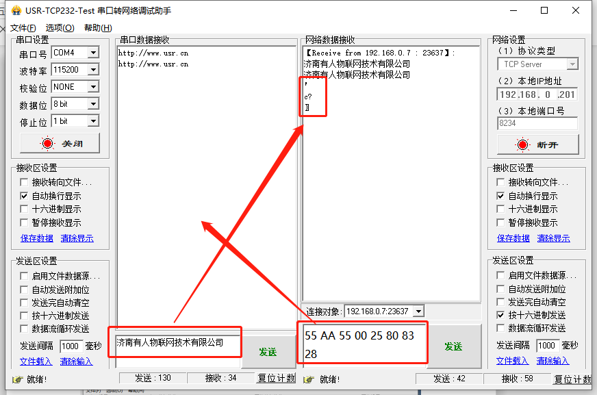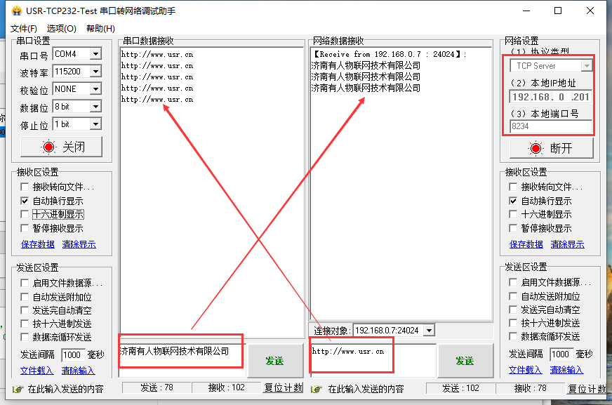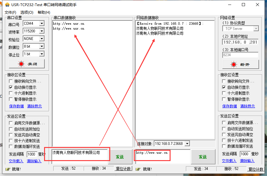 將軟件串口設(shè)置中的串口號(hào)配置為COM4。由于設(shè)備默認(rèn)協(xié)議類型為TCP Client,所以電腦端連接設(shè)備需要設(shè)置為T(mén)CP server。服務(wù)器IP設(shè)置為電腦IP:192.168.0.201。端口號(hào)設(shè)置為301默認(rèn)參數(shù)中的“連接目標(biāo)端口”:8234
