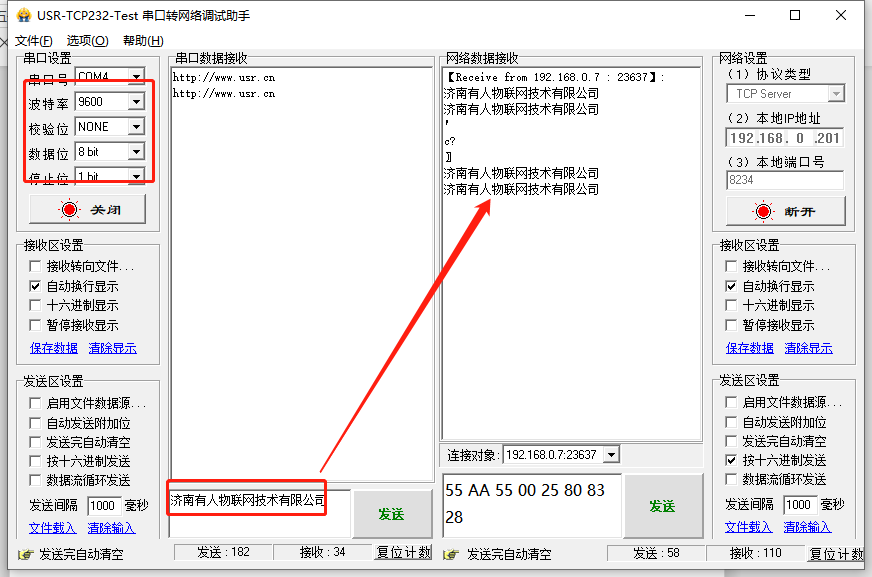 將模塊串口參數(shù)修改為9600、NONE、8、1,需要網(wǎng)網(wǎng)絡(luò)端按十六進(jìn)制下發(fā)55 AA 55 00 25 80 83 28,發(fā)送完成后,軟件打開(kāi)串口需要修改為9600、NONE、8、1, 不然數(shù)據(jù)會(huì)顯示為亂碼。