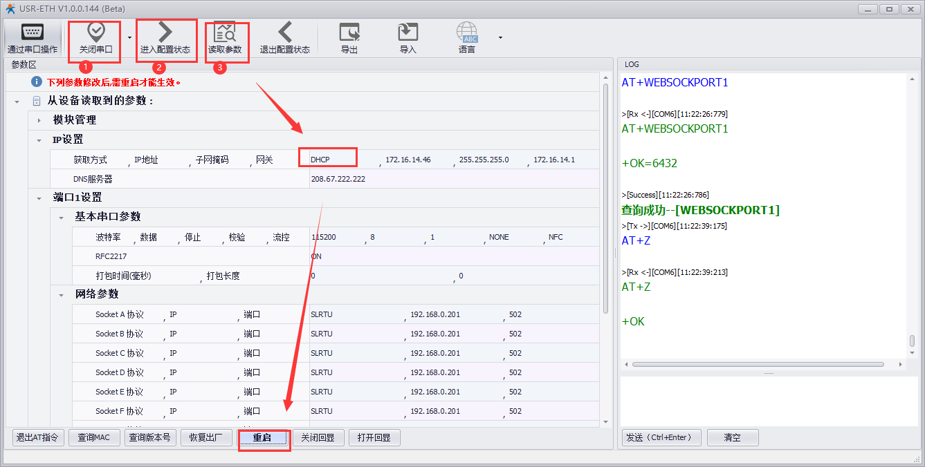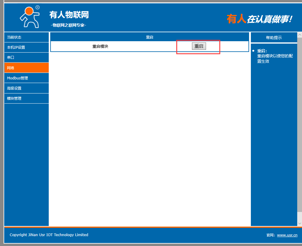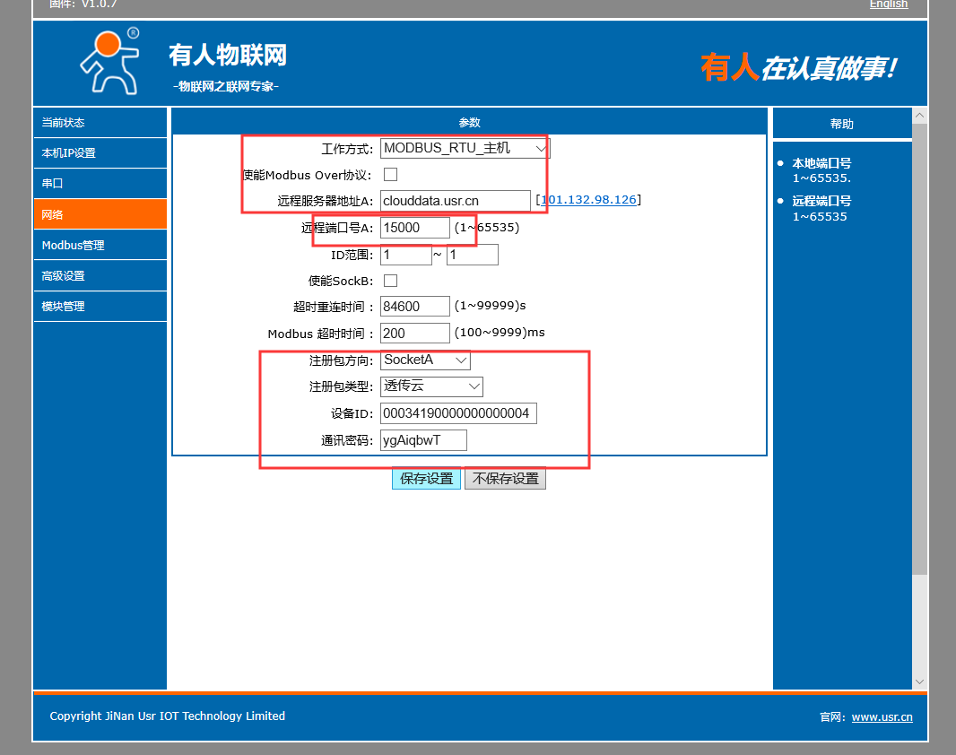5.設(shè)置相關(guān)參數(shù)。選擇工作方式為MODBUS TU,遠(yuǎn)程服務(wù)器為clouddata.usr.cn,端口號(hào)為15000。開啟注冊(cè)包,注冊(cè)包使用SOCKET A、透?jìng)髟啤TO(shè)備ID是通過有人云中設(shè)備列表查看按鈕查看設(shè)備SN與通訊密碼,填寫入內(nèi)置網(wǎng)頁。