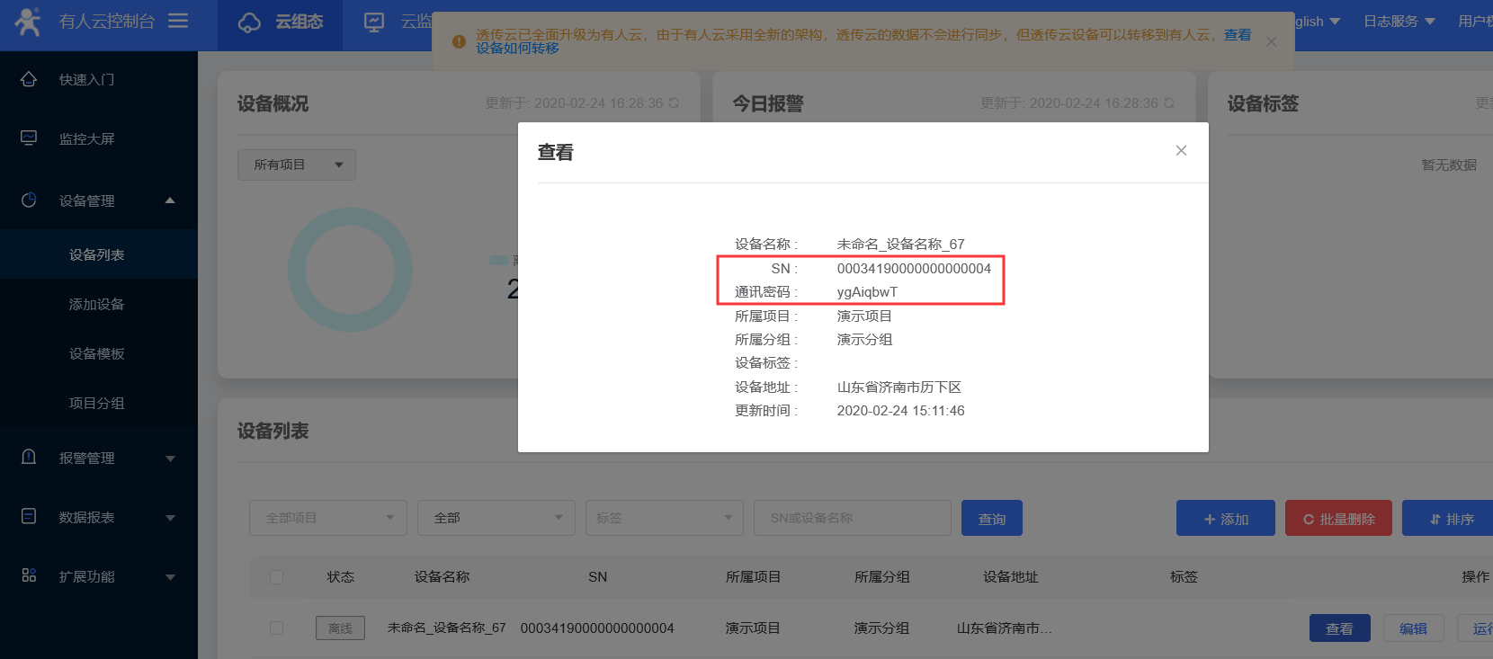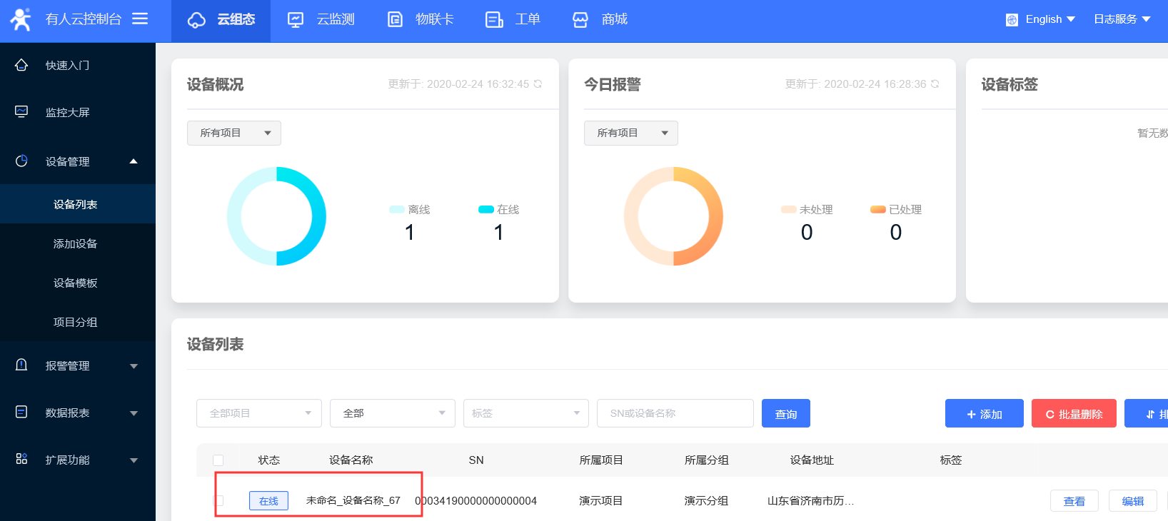 7.完成設(shè)置后回到有人云,即可看到設(shè)備上線成功。