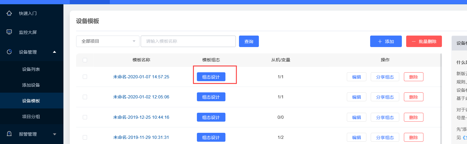 8.將進(jìn)入設(shè)備管理——設(shè)備模板——組態(tài)設(shè)計(jì),拖拽控件綁定數(shù)據(jù)點(diǎn),完成組態(tài)繪制