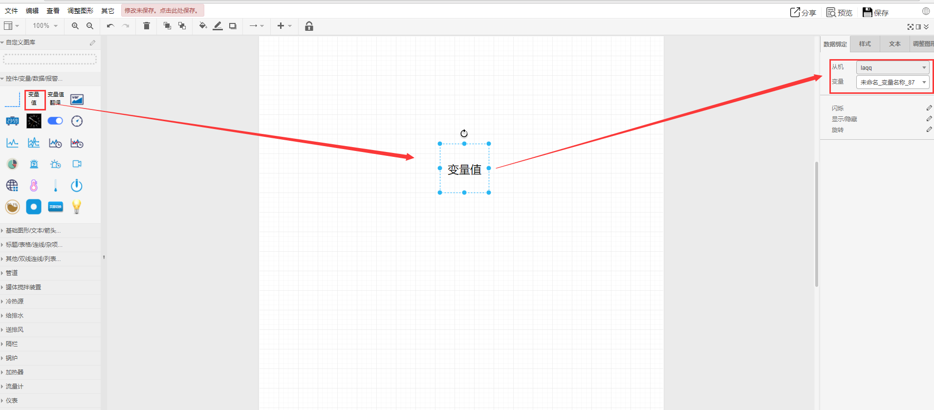 9.進(jìn)入組態(tài)設(shè)計(jì),在左側(cè)控件欄選擇設(shè)備模板中所添加設(shè)備數(shù)據(jù)點(diǎn)的展示類型控件,這里以數(shù)值型數(shù)據(jù)為例,拖拽變量值控件至畫布,最左側(cè)綁定數(shù)據(jù)點(diǎn),點(diǎn)擊保存預(yù)覽后,即可在大屏展示組態(tài)。