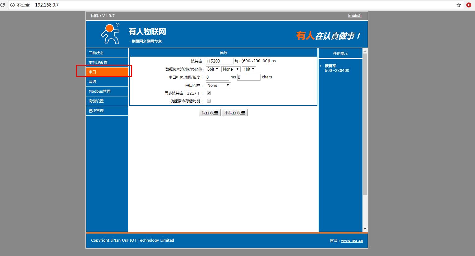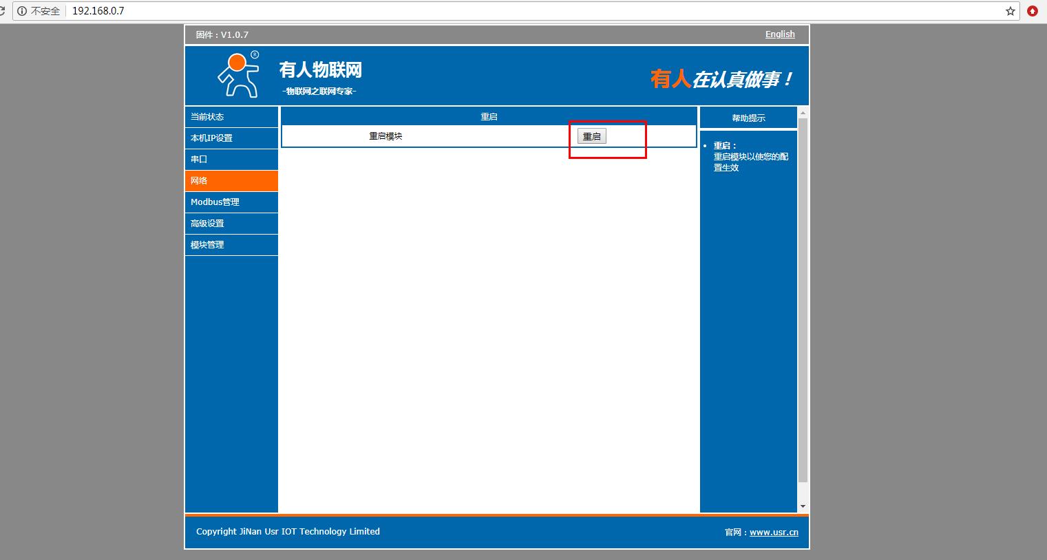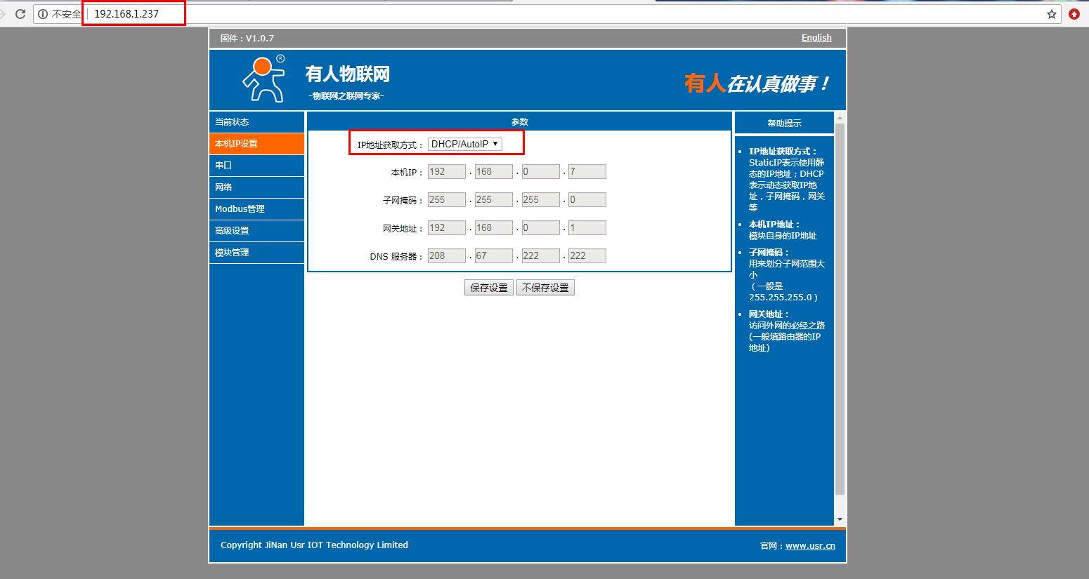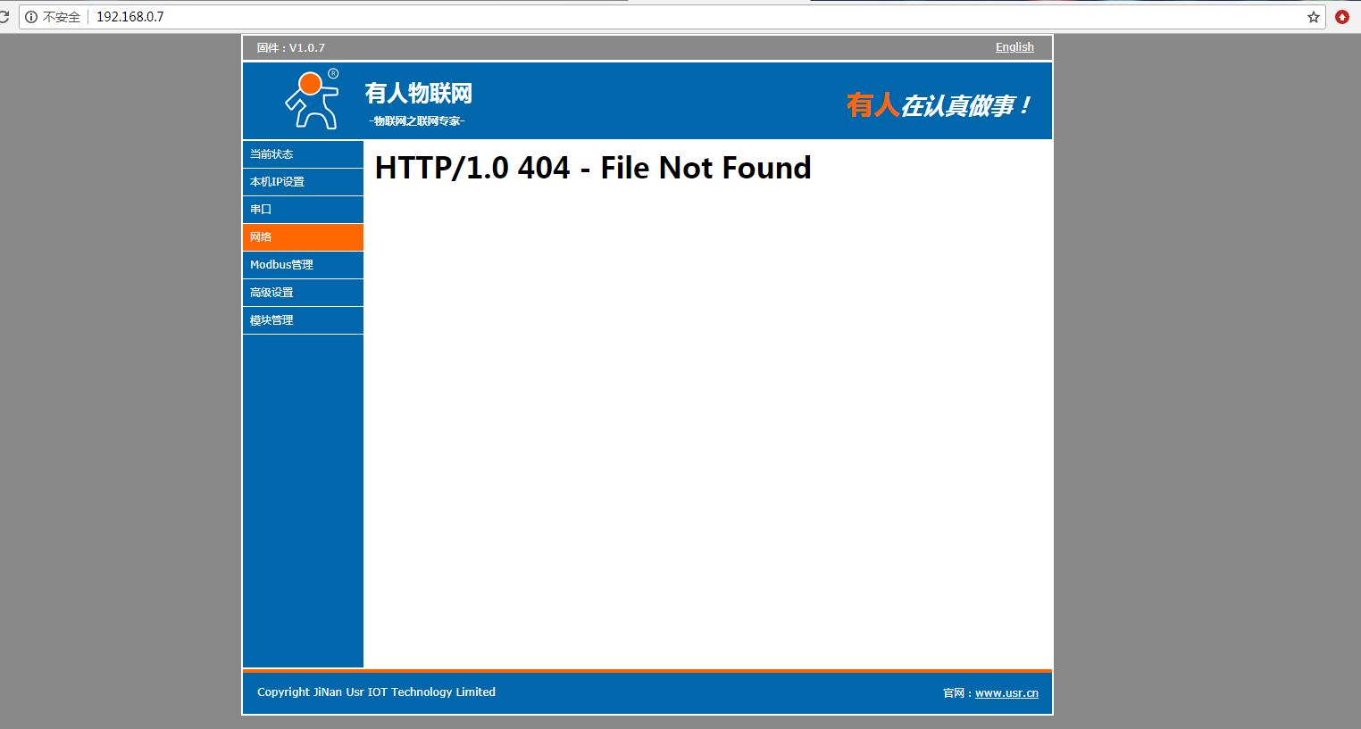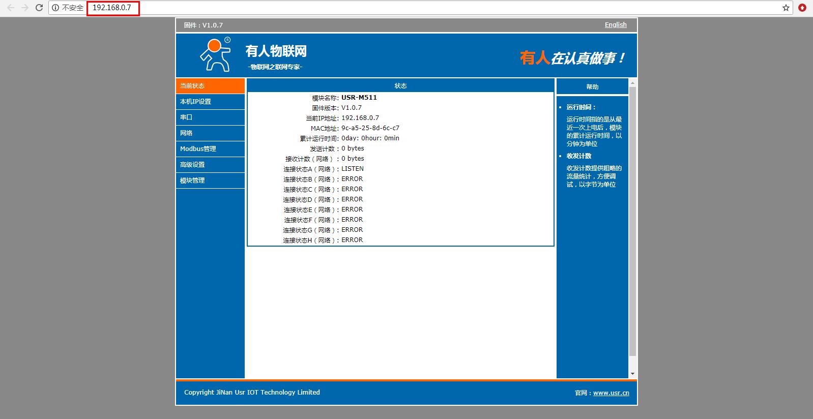 在電腦打開瀏覽器,輸入靜態(tài)IP192.168.0.7 登錄USR-M511的內置網頁。