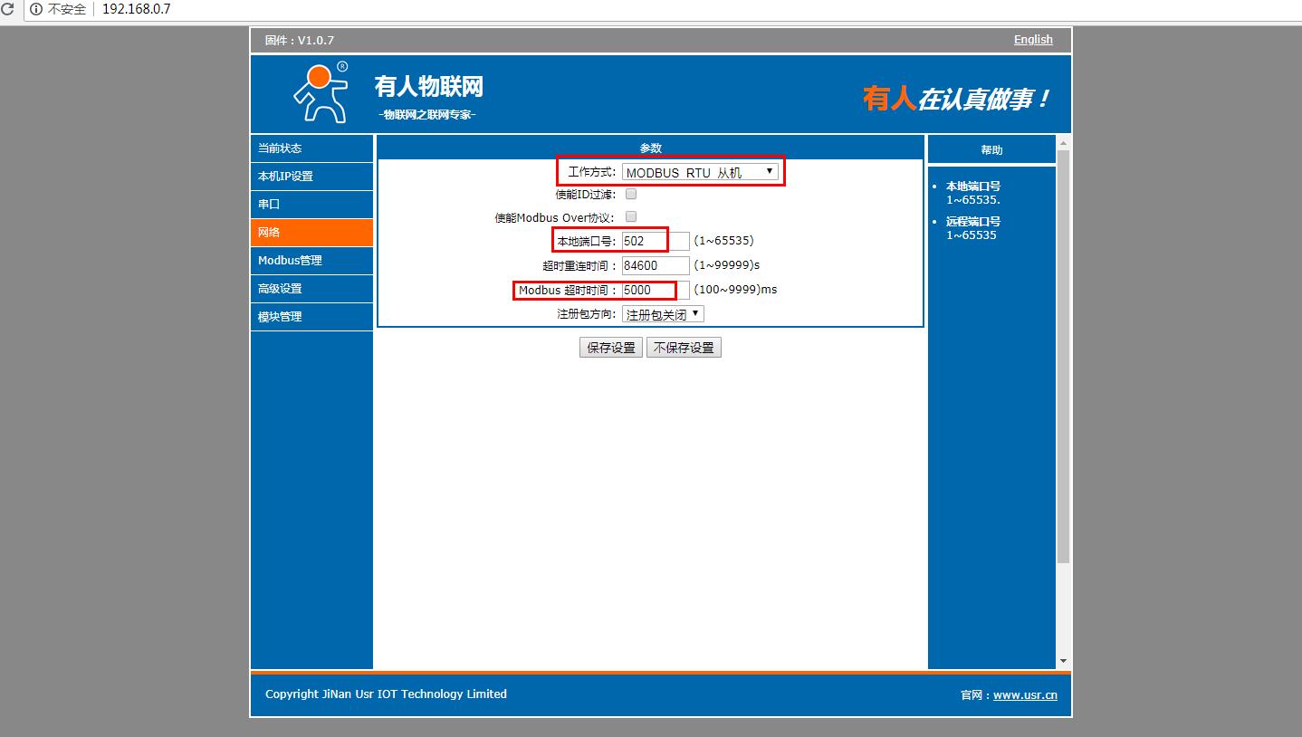網頁檢查串口參數,工作方式設置MODBUS RTU從機模式,本地端口號默認是502,Modbus 超時時間默認是200ms,需要改大,改成5000ms。