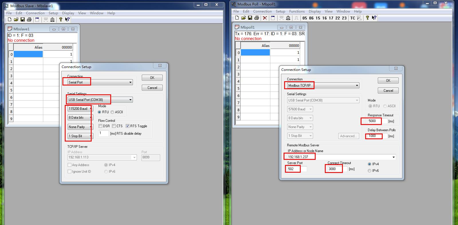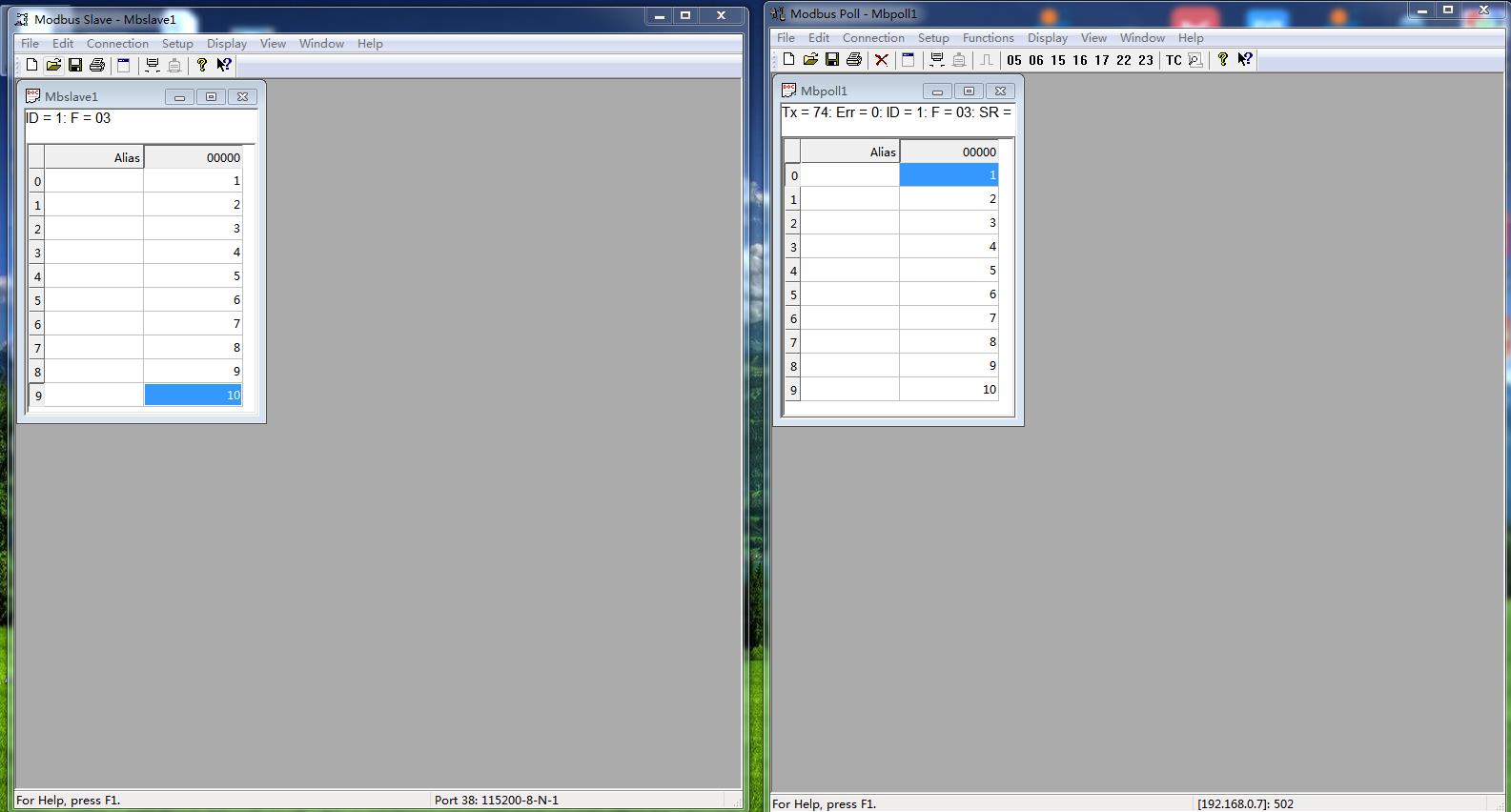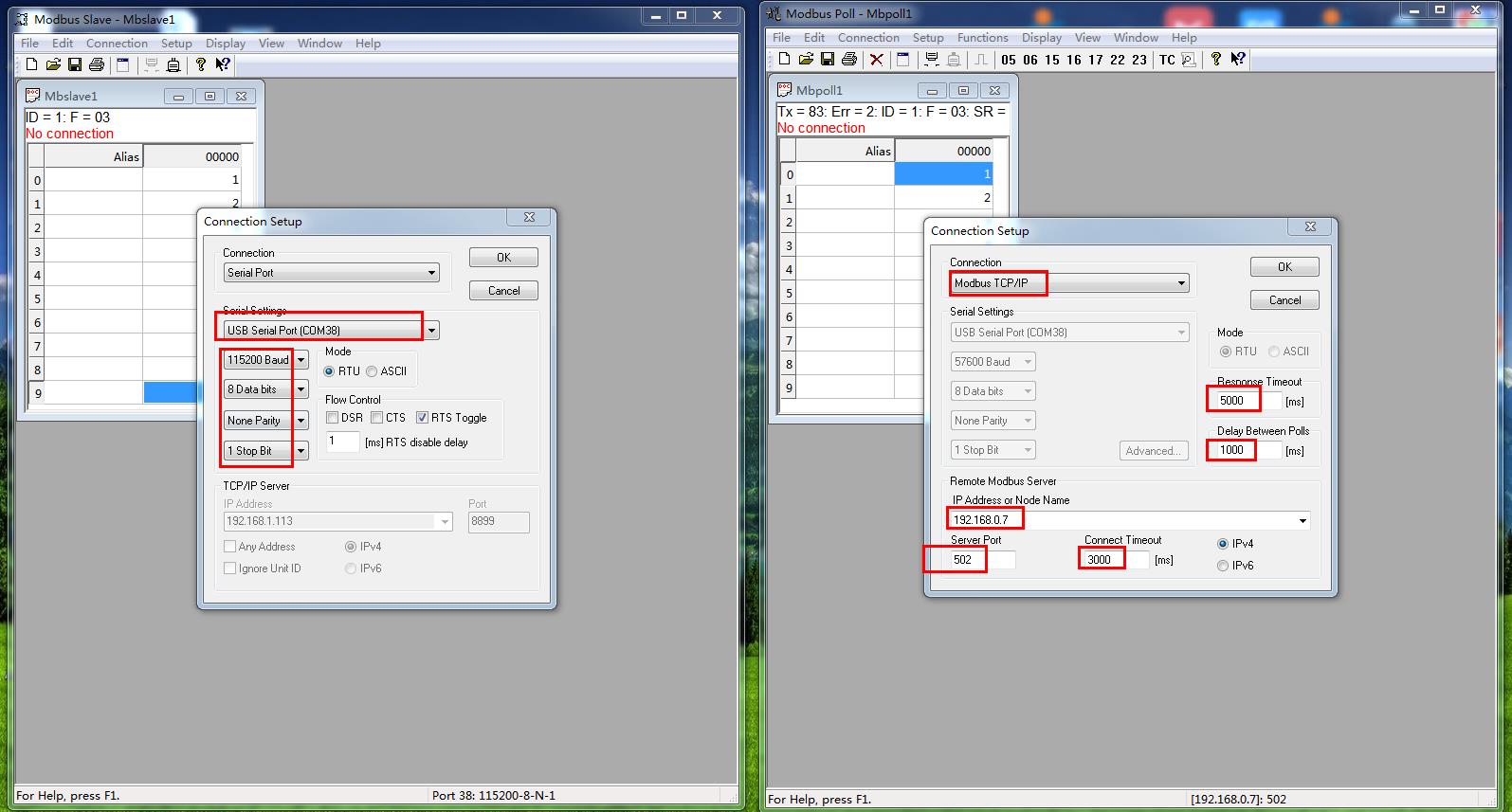 模擬測試用MODBUS SLAVE軟件做串口設備,用MODBUS POLL軟件做網絡端。