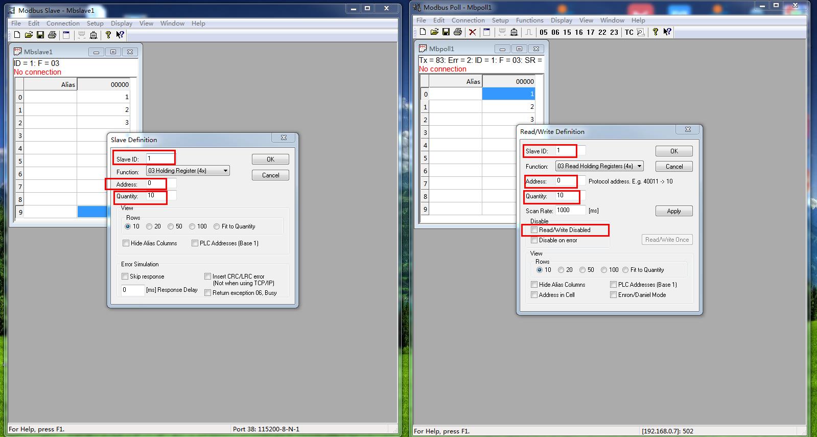 4、MODBUS SLAVE和MODBUS POLL軟件設置: