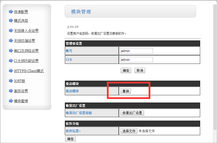 進(jìn)入模塊管理子頁面,重啟模塊,也可以斷電重啟。