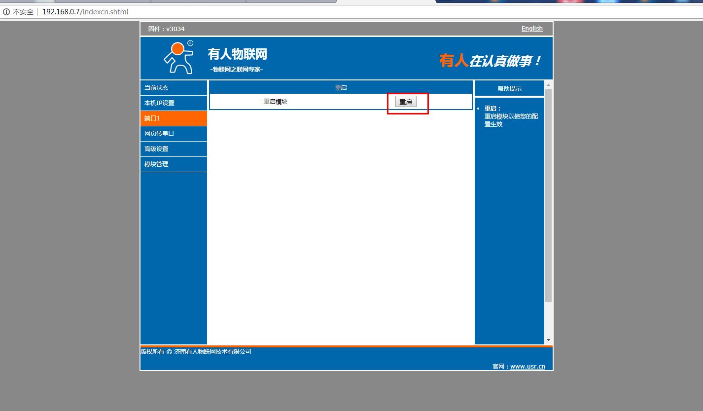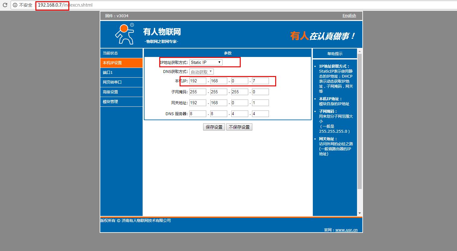 在電腦打開瀏覽器,輸入靜態(tài)IP192.168.0.7 登錄USR-N510的內置網(wǎng)頁。