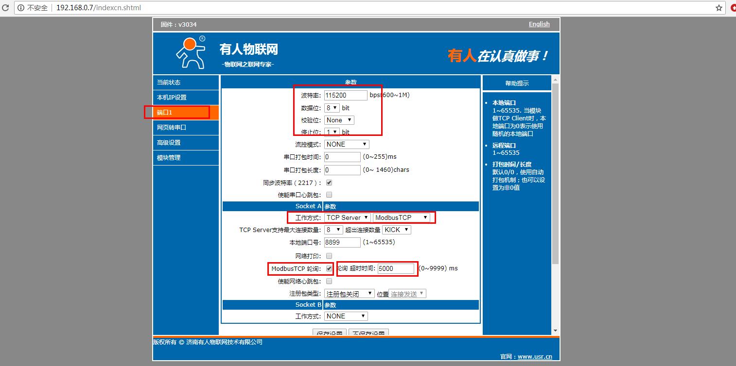 網(wǎng)頁檢查串口參數(shù),工作方式設置TCP serverModbusTCP,本地端口號默認是8899,Modbus TCP輪詢默認是關閉,需要勾選開啟MODBUS TCP輪詢。
