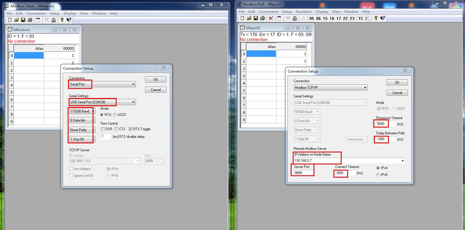 模擬測試用MODBUS SLAVE軟件做串口設備,用MODBUS POLL軟件做網(wǎng)絡端。