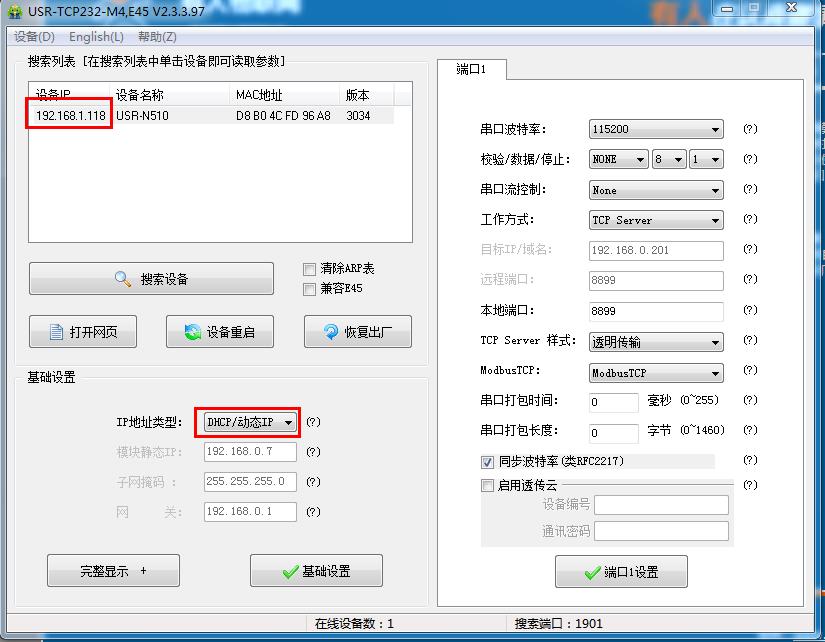 用M4設置軟件搜索USR-N510的IP是192.168.1.118