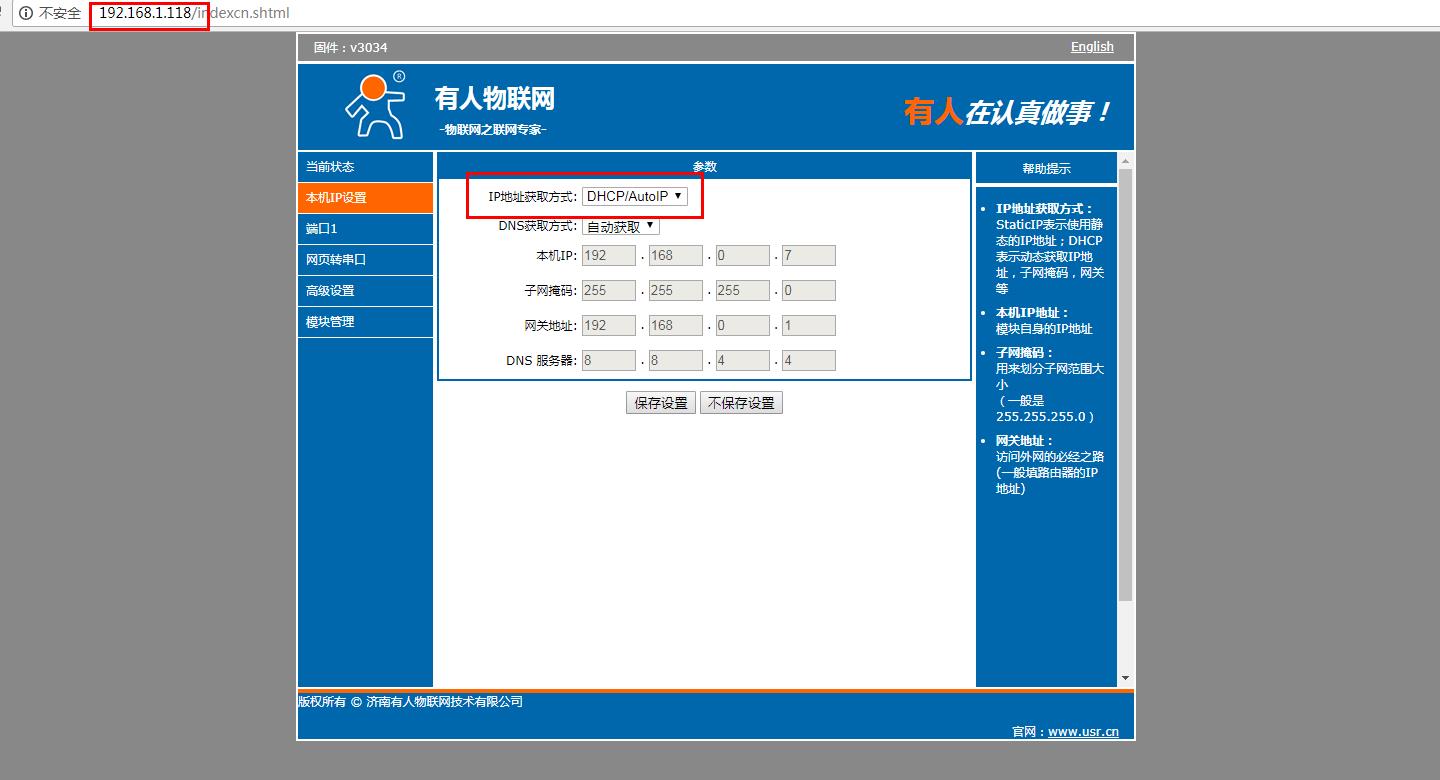 在電腦打開瀏覽器,輸入靜態(tài)IP192.168.1.118 登錄USR-N510的內置網(wǎng)頁。