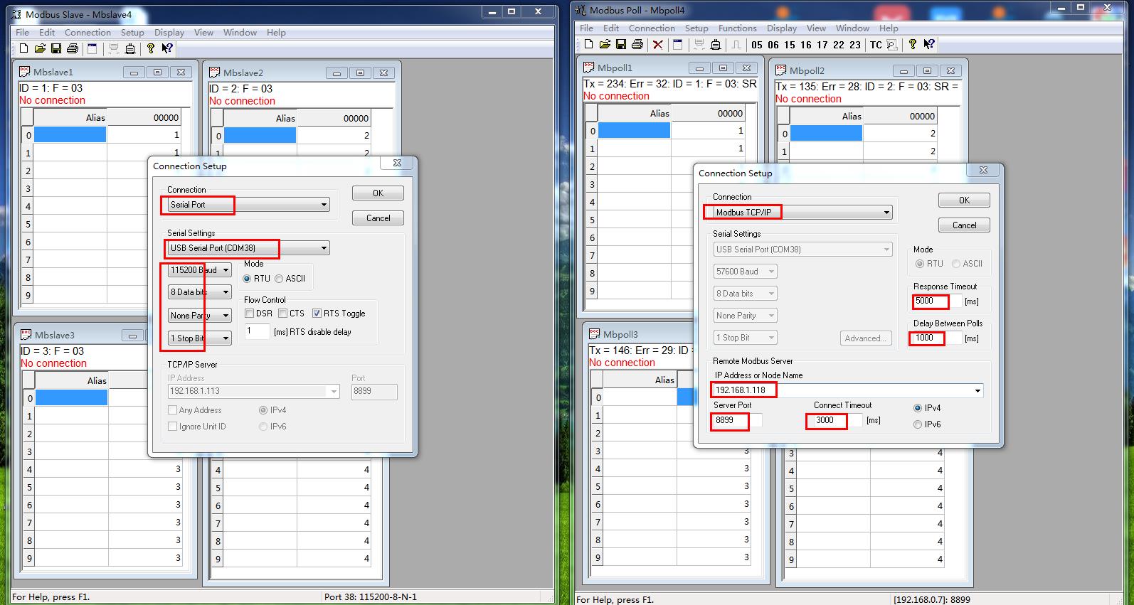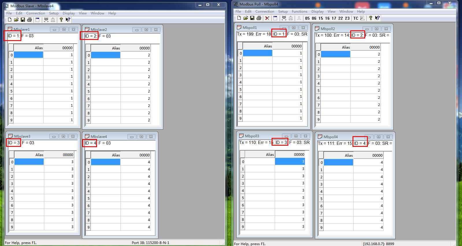 MODBUS POLL軟件對應添加4個SLAVE ID,依次是ID 1 ID 2 ID 3 ID 4。