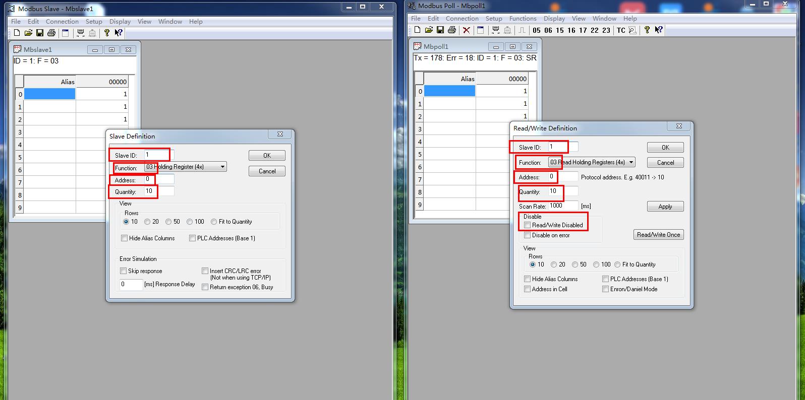 4、MODBUS SLAVE和MODBUS POLL軟件設置: