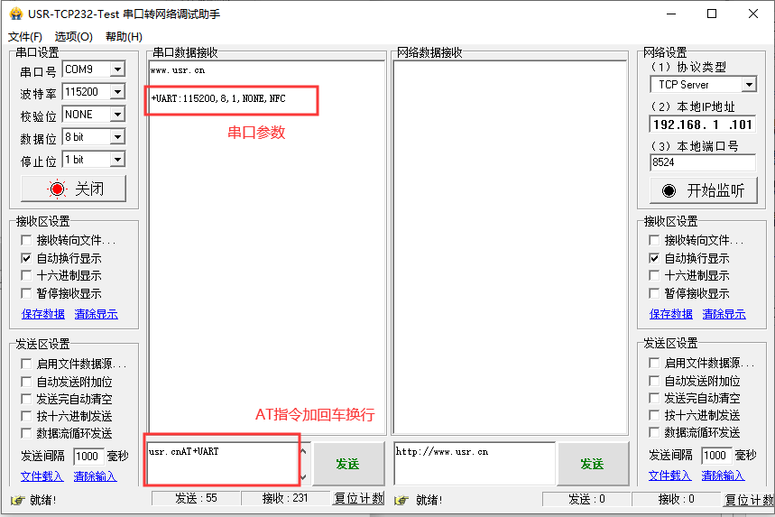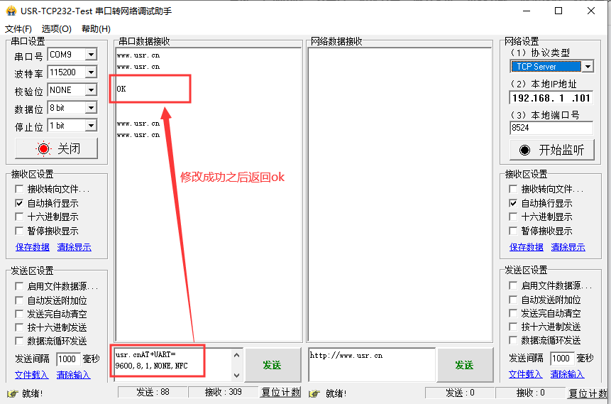 usr.cnAT+UART=9600,8,1,NONE,NFC,修改成功之后模塊會(huì)返回ok。