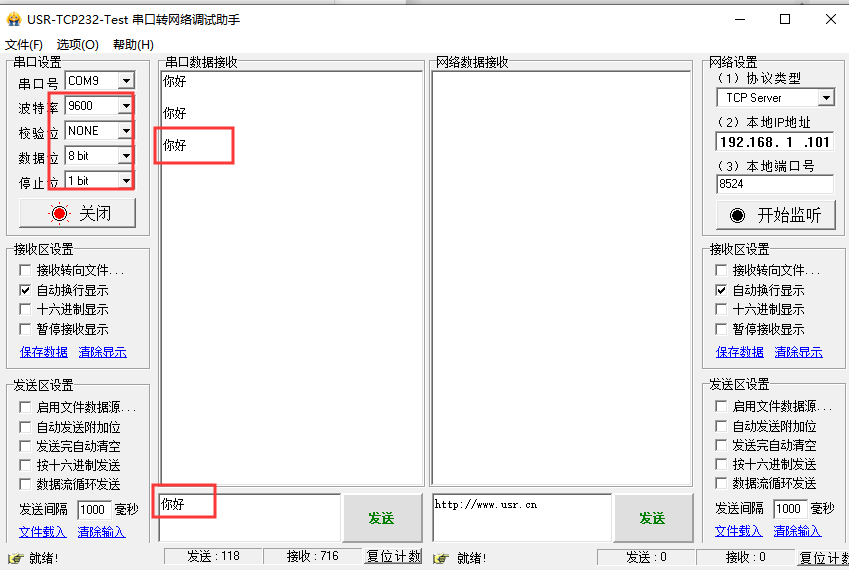 5、生效之后,DTU會(huì)重啟,此時(shí),將串口助手串口波特率修改為9600,然后重新打開(kāi)串口,我們?nèi)我獍l(fā)送指令與DTU通信,可以進(jìn)行正常通信。