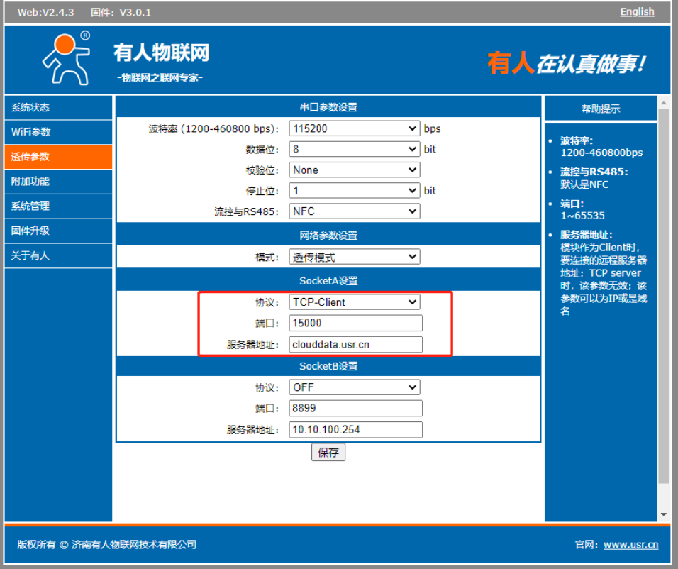 4>在透傳參數(shù)設(shè)置模式--透傳模式,SocketA設(shè)置為TCP clinet