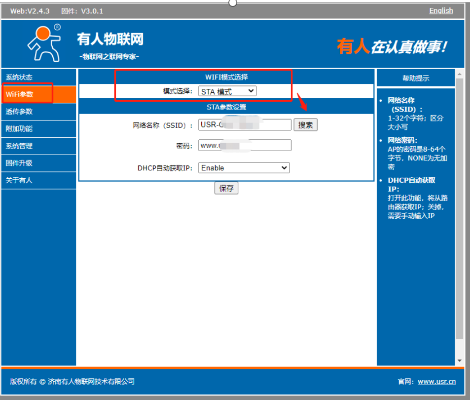 3>在WIFI參數(shù)里面選擇STA模式,搜索現(xiàn)場2.4Gwifi(密碼不可以有中文特殊字符)點(diǎn)擊保存,暫時不重啟