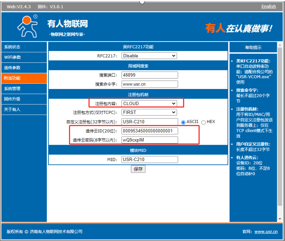 5>附加功能--注冊包--開啟--類型選擇cloud,將之前云端添加的C210的設(shè)備ID和密碼填寫到注冊包里