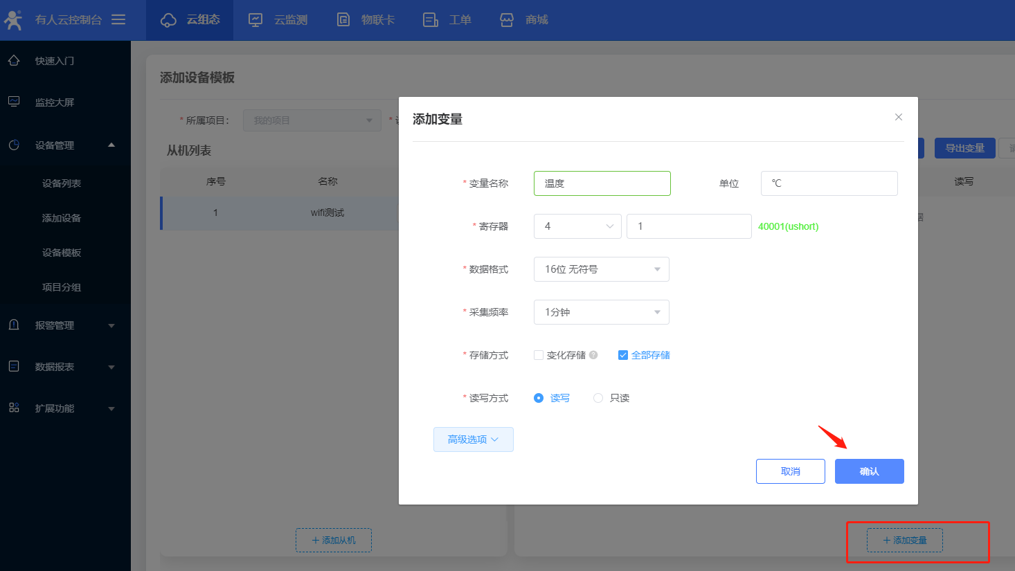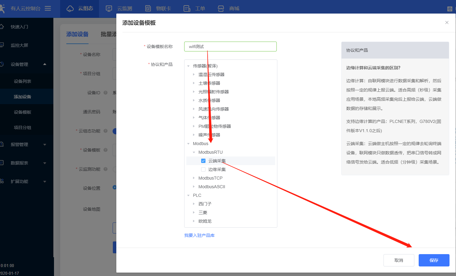 7、模板更改名稱,選擇“Modbus” - “ModbusRTU” - “云端采集”,點(diǎn)擊“確認(rèn)添加”。