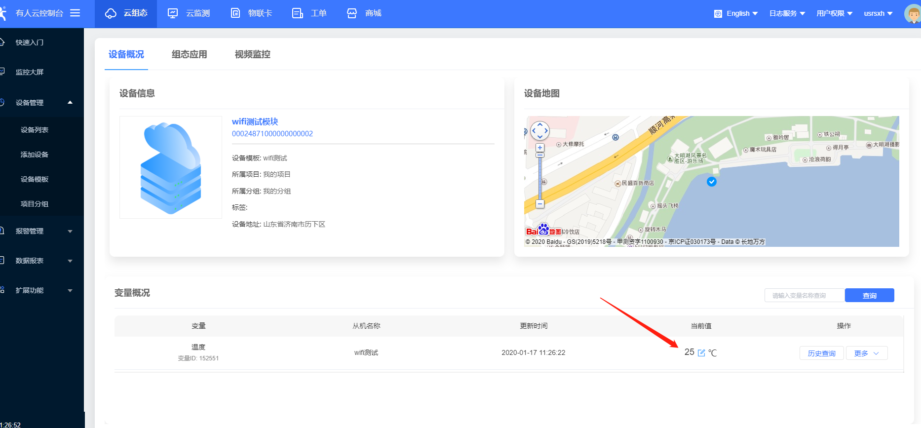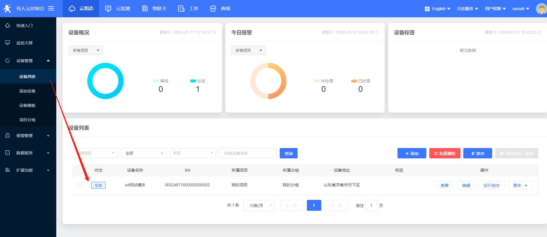 15、設(shè)置完所有的參數(shù)要重啟設(shè)備,稍等一會(huì),在有人云界面,您會(huì)看到設(shè)備已經(jīng)上線