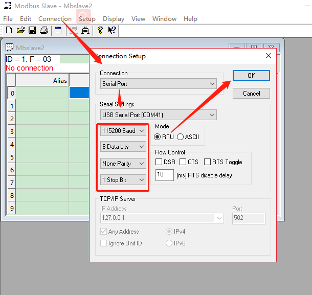 16、打開(kāi)modbus軟件,點(diǎn)擊連接。選擇串口com41(C215的串口用usb轉(zhuǎn)232接到電腦上的),串口參數(shù)要和C215一致。