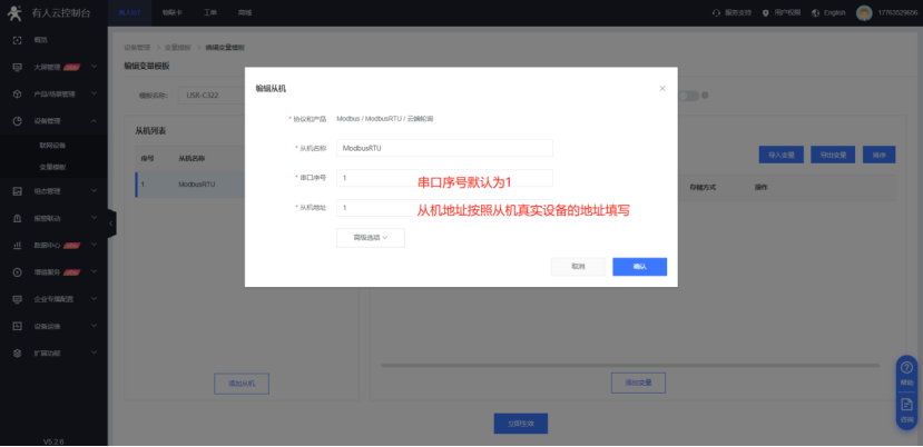 4.添加從機,設置從機名稱,串口號為1,從機地址是接在WIFI模塊的串口上的終端設備的從機地址(如果不清楚,可以咨詢終端設備的廠家)。