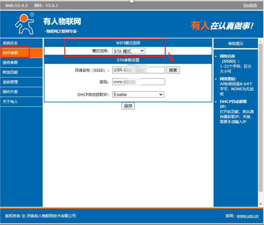 3>在WIFI參數(shù)里面選擇STA模式,搜索現(xiàn)場2.4Gwifi(密碼不可以有中文特殊字符)點(diǎn)擊保存,暫時(shí)不重啟