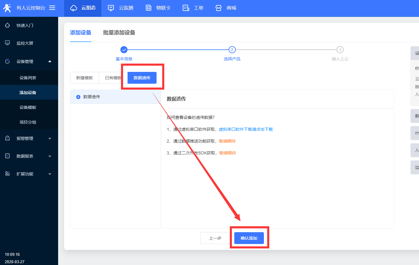 1、登陸云平臺后,在 設備管理》添加設備 中添加一個設備,點擊框后面的藍字“沒有SN”
